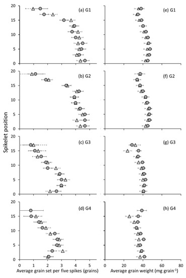 Values are predicted means (n = 45 spikes per data point) of average grain set and grain weight in heated and non-heated plots at a lower incidence of frost (mid-May 2019, 17 May 2019, Table 1, Figure 4). Grain set is shown from G1 to G4 (a–d) (Figure 3) and average grain weight along the spike in each grain position of the spikelet is shown from G1 to G4 (e–h). Heated plot (grey circles) and non-heated plot (white triangles). Horizontal bars are ± standard errors.