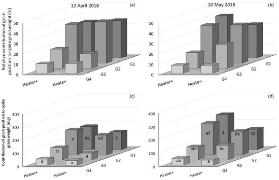 The relative contribution of grain at each position of the spikelet (grain position) to spike grain weight in Wyalkatchem sown in mid-April (12 April 2018 (a)) and mid-May (10 May 2018 (b)) sampled from heated and frosted non-heated plots. Absolute spike grain weights for the same sowing dates are shown on (c,d) with significance (p < 0.05) noted by letters with each sowing date compared separately. Relative contributions are calculated from the predicted means of absolute spike grain weights (n = 45 spikes per data column).
