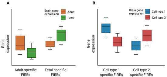 Cartoon illustration of expression for genes overlapping developmental time- or cell type-specific FIREs: (A) Boxplots of expression for genes overlapping fetal or adult brain FIREs. (B) Boxplots of expression for genes overlapping cell type specific FIREs. The figure was inspired by results presented in Schmitt et al. [11] and Crowley et al. [66].