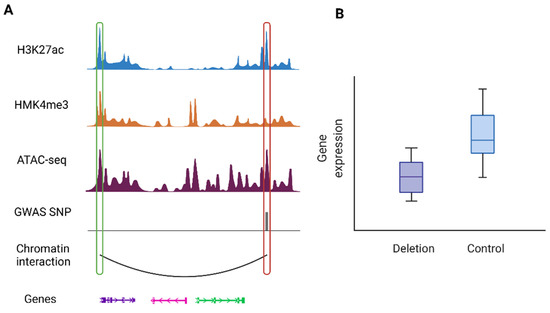 An illustrative example of a chromatin interaction involving disease-associated variants: (A) An example of a PIR containing a risk variant (highlighted by the red box on the right) with promoter region of the target gene (highlighted by the green box on the left). (B) Regulatory roles of the risk variant can be validated by downstream experiments such as CRISPR techniques. This example shows deletion of the PIR containing the risk variant results in downregulation of the target gene (the left most gene). The figure was inspired by results presented in Song et al. [61].
