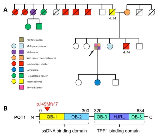 - McMaster, M.L.; Sun, C.; Landi, M.T.; Savage, S.A.; Rotunno, M.; Yang, X.R.; Jones, K.; Vogt, A.; Hutchinson, A.; Zhu, B.; et al. Germline mutations in protection of telomeres 1 in two families with hodgkin lymphoma. Br. J. Haematol. 2018, 181, 372–377. [Google Scholar] [CrossRef] [PubMed]