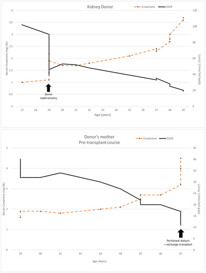 Serum creatinine and EGFR of kidney donor 1 compared to his mother’s clinical course.