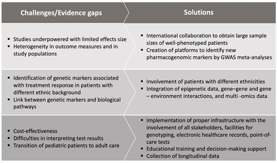 Starting from patients’ genetic information, pharmacogenomics aims to contribute to predicting responses to the given treatment. There is evidence that a pharmacogenomic approach enhances the knowledge necessary for treatment decision-making in the pediatric care setting, providing information for drug selection and dosing options [37]. However, although pharmacogenomic testing has recently mainly become available and less costly, its use in pediatric clinical practice is scarce, especially outside academic centers and specialized institutions. Major barriers to its implementation include difficulties in interpretation of test findings and the need for education and support in decision-making for pediatricians. Generally, clinicians and healthcare providers are not confident approaching pharmacogenomics in routine clinical practice [38]. Indeed, a recent survey of pediatricians revealed that, although 80% recognized that pharmacogenomic testing would improve treatment efficacy and safety, fewer than 10% were familiar with pharmacogenomics. Moreover, most were interested in educational training, particularly in test interpretation and treatment recommendations [39]. Therefore, education on pharmacogenomics through ad hoc training courses and e-learning modules should be increasingly delivered to healthcare professionals, including pediatricians, and should be included in the curriculum of every university medical school.
