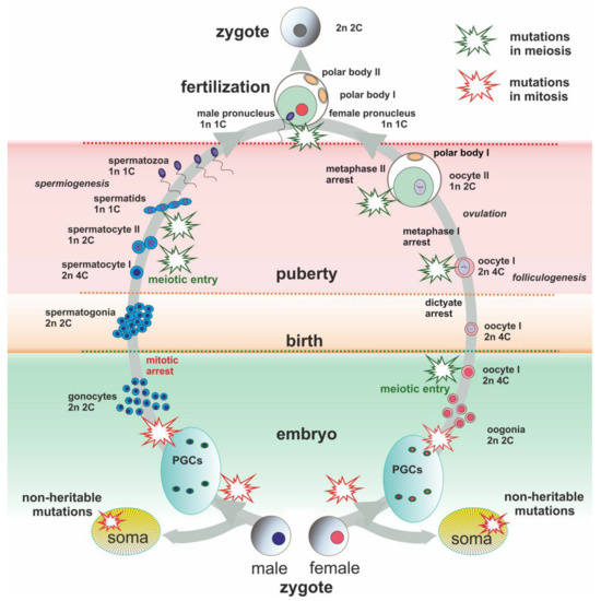 Schematic presentation of main events of male and female lifespan. Evolutionarily significant de novo chromosome rearrangements might occur during the lifespan and be transmitted to descendants. Somatic mutations are not inherited unless they can lead to the same type of chromosome rearrangements. Schematic explosions mark points of possible heritable mutations (green for meiotic origin and red for mitotic origin).