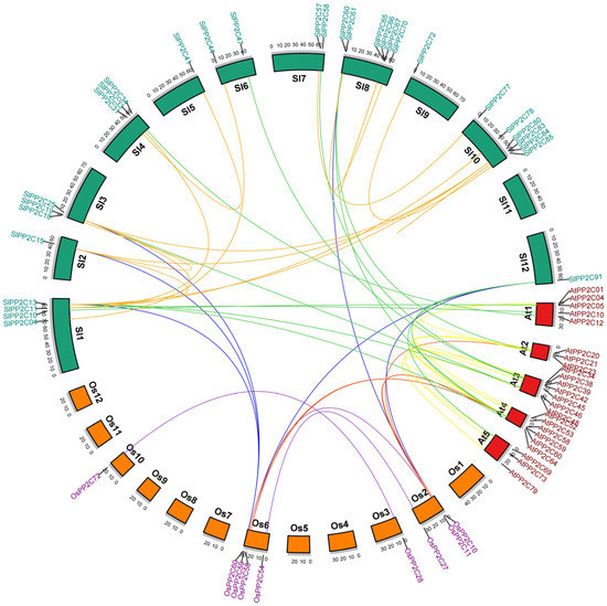 Duplication event analysis of SlPP2C genes and comparative synteny analysis among tomato, Arabidopsis, and rice, between tomato and Arabidopsis, and between tomato and rice. The red line represents the syntenic gene pairs between rice and Arabidopsis. The blue line indicates the syntenic gene pairs between rice and tomato. The green line represents the syntenic gene pairs between tomato and Arabidopsis. The golden line represents the syntenic gene pairs in tomato. The yellow line represents the syntenic gene pairs in Arabidopsis. The purple line represents the syntenic gene pairs in rice. Tomato chromosomes are depicted as green segments, and Arabidopsis and rice are shown in red and orange, respectively. The chromosome number and syntenic gene pairs are marked. The size of chromosomes was consistent with the actual pseudo-chromosome size. Positions are in Mb.