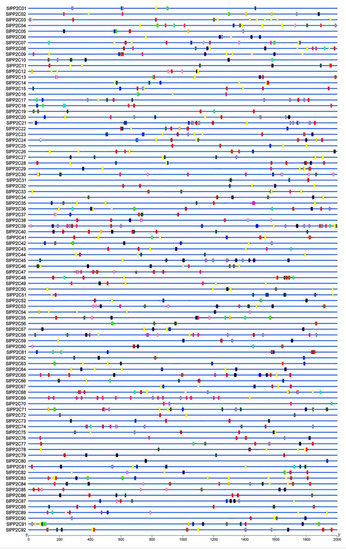 In order to better understand the conservation and diversity of motif compositions and gene structures of SlPP2Cs, the conserved motifs and exon–intron organization of SlPP2Cs were analyzed and a new phylogenetic tree as a reference was also structured (Figure 4). The conserved motifs of SlPP2C proteins were analyzed using the software MEME and 10 distinct conserved motifs were identified (Table 4). In Figure 4A, the number of motifs ranged from 1 to 10 with 15–50 residues in all SlPP2C proteins. Motifs 1, 2, 3, 4, 5, 6, 8, 9, and 10 ubiquitously existed in SlPP2Cs, which showed that these motifs may have similar conserved positions and functions. Interestingly, motif 7 was selectively presented in a few SlPP2Cs, and they all belong to group H. Therefore, motif 7 may have an unusually special role in the process of regulation.