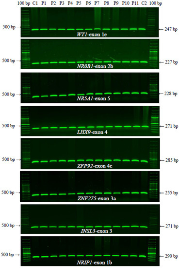 To gain insight into potentially important gonadogenesis-determinant genes and ovarian function associated with POI, genetic variants or exonic/coding mutations were investigated by PCR-SSCP-sequencing assays and pathogenicity prediction programs. Eight candidate genes (WT1 (NM_024426.6), NR0B1 (NM_000475.5), NR5A1 (NM_004959.5), LHX9 (NM_020204.3), ZFP92 (NM_001136273.2), ZNF275 (NM_001080485.4), INSL3 (NM_001265587.2), and NRIP1 (NM_003489.4)) were analyzed. Figure 1 contains a representative image of one exon from each gene to illustrate the specific exonic amplifications analyzed in the eight candidate genes identified in the patients with POI (P1–P11) and two healthy subjects (C1 and C2). The PCR amplicons exhibited an expected molecular size of 200–300 bp, similar to the healthy control subjects. Extensive insertions, deletions, and duplications were excluded in all of the exonic regions analyzed by PCR.
