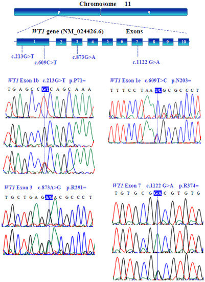 The present study revealed 13 single-nucleotide variants (SNVs), and to the best of our knowledge, seven of them are reported for the first time (WT1 (c.609T>C, c.873A>G, c.1122G>A), NR0B1 (c.353C>T, c.425G>A), NR5A1 (c.437G>C: rs1110061, IVS4-20C>T), LHX9 (IVS2-12G>C: rs12122995, IVS3+13C>T: rs13376365, c.741T>C: rs12046958), ZNF275 (c.969C>T), and NRIP1 (c.3403C>T: rs61750207)). Five were novel synonymous SNVs (sSNVs), one was a novel non-synonymous SNV (nsSNV), and one a novel non-coding SNV (ncSNV) (Table 1); these sSNVs were not found in the catalogue of common human genetic variations (1000 Genomes Project: https://www.ncbi.nlm.nih.gov/variation/tools/1000genomes/, accessed on 1 March 2022 and Genome Aggregation Database: https://gnomad.broadinstitute.org/, accessed on 1 March 2022).