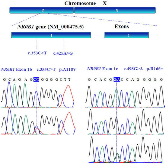 X-chromosome and exon representations of the human NR0B1 (NM_000475.5) gene. Exons (1 and 2) were analyzed by capillary electrophoresis. Human NR0B1 gene sequence variants were identified in exon 1 (blue box) from patients with POI. The presented fragment of the nucleic acid sequence of the NR0B1 gene contains both the non-synonymous and synonymous variants.