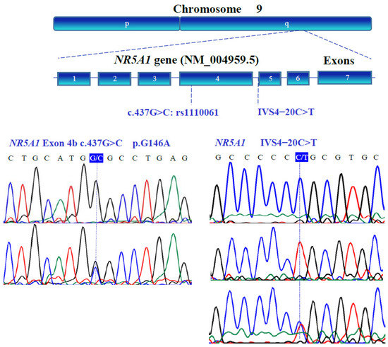 Partial nucleotide sequence of the human NR5A1 (NM_004959.5) gene and a structural diagram of its location on chromosome 9. Genotypic variants in the coding/non-coding regions are located in exon 4 and intron 4 (blue boxes), respectively. Exons are indicated with blue boxes.