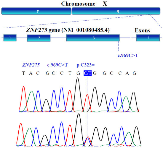 The ZNF275 (NM_001080485.4) gene variant on the long arm of the X chromosome was verified by Sanger sequencing. A homozygous variant (TGT) and heterozygous variant (TGT/TGC) were found in exon 3 (blue box).