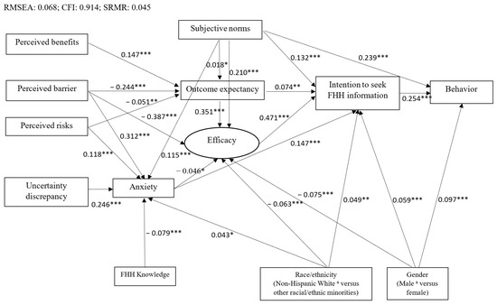 As shown in Figure 2, female young adults in this study were more likely to collect, and to actually collect their FHH from family members when compared to their male counterparts (β = 0.059, p < 0.001; β = 0.097, p < 0.001, respectively). Furthermore, participants who were members of racial and ethnic minority groups had a higher level of anxiety associated with lacking FHH information (β = 0.043, p < 0.05) and stronger intention to collect their FHH (β = 0.049, p < 0.005), but had lower efficacy in FHH collection (β = −0.063, p < 0.001) than non-Hispanic White respondents. Respondents with better FHH knowledge reported less anxiety (β = −0.079, p < 0.001).