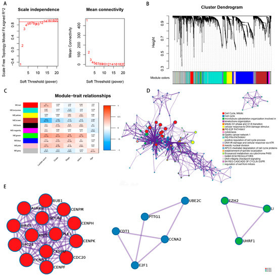 Finally, in order to explore the potential mechanism of our model for predicting prognosis, we performed a weighted gene co-expression network analysis in the TCGA cohort based on the previously identified differentially expressed genes. We analyzed 2936 differentially expressed genes in the TCGA cohort through WGCNA. According to the suggestion of pickSoftThreshold, the soft threshold power of the β value was set to 14 (Figure 7A). Subsequently, all genes related to ccRCC were hierarchically clustered into 10 gene modules (Figure 7B). The correlation analysis shows that the green model (MEgreen) has the highest correlation with the risk score (Figure 7C). Then we performed a functional enrichment analysis of the genes in the green module, and we found that the most relevant signal pathway for risk score is the cell cycle (Figure 7D). Ultimately, we performed protein–protein interaction analysis (Figure 7E) on the genes in the first three signal pathways of Figure 7D.