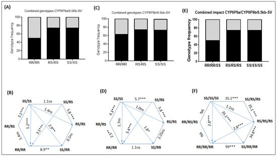 3.2. Cumulative Effect of 6.5Kb-SV and the Duplicated CYP6P9a and CYP6P9b on the Fecundity of Female An. funestus