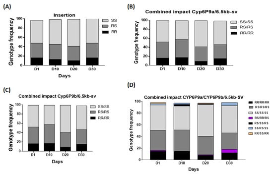 - Mugenzi, L.M.; Menze, B.D.; Tchouakui, M.; Wondji, M.J.; Irving, H.; Tchoupo, M.; Hearn, J.; Weedall, G.D.; Riveron, J.M.; Cho-Ngwa, F.; et al. A 6.5-kb intergenic structural variation enhances P450-mediated resistance to pyrethroids in malaria vectors lowering bed net efficacy. Mol. Ecol. 2020, 29, 4395–4411. [Google Scholar] [CrossRef]