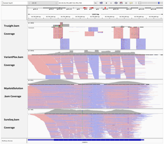 Next generation sequencing technologies refer to a constellation of sequencing methods that share massively parallel sequencing, high throughput, and lower cost [16]. In the clinic, this has allowed for comprehensive genomic profiling to facilitate the timely detection of genetic variants with diagnostic, prognostic, or therapeutic import. In myeloid malignancies, namely AML, the detection of FLT3 and CEBPA alterations are crucial for that very reason [9]. Unfortunately, until recently, limitations in the ability of NGS to detect alterations in these genes required duplicate testing by more sensitive orthogonal method [17]. This prompted academic and private sector efforts in the field to surmount this challenge resulting in various commercially available solutions that claim to reliably detect mutations in this gene [18,19,20]. To increase efficiency in our laboratory workflow by eliminating duplicate testing and to verify vendor claims of accuracy, we performed a head-to-head comparison of TruSight Myeloid (Illumina, San Diego, CA, USA), VariantPlex (Archer), SureSeq (OGT), and Myeloid Solution (SOPHiA) panels in our CAP/CLIA-certified laboratory at a high-volume cancer center.
