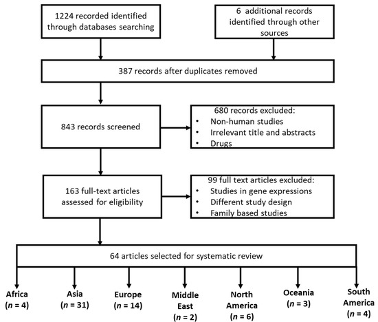 Using our search strategy (Figure 1), we have identified 1230 related studies, of which four (n = 4) were from the African continent and (n = 60) were from non-African continents (globally). Based on our inclusion and exclusion criteria, there were 321 cases and 308 controls for the African population and 15,865 cases and 28,762 controls for other global populations globally, that were available for this analysis. The study characteristics are described in Table 1. In all the studies reported in Africa [15,16,34,35], HTN was defined as systolic/diastolic BP (SBP/DBP) ≥ 140/≥ 90 mm Hg. Among the included studies reported in the African region (n = 4), only two (n = 2) studies reported a significant association between the MTHFR (rs1801133) and the risk of developing HTN [16,34]. All African studies, where age was reported, included only patients aged above 40 years, except for Amin et al. [35], which included patients aged ≤ 45 years. Furthermore, most African studies included more females than males with exception of Amin et al. [35] which did not report on gender. In studies reported in other continents (n = 60), forty-seven separate studies showed a significant association between MTHFR (rs1801133) and the risk to develop HTN Table 2, whereas the remaining studies did not show any significant association (n = 14).