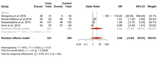 It must be pointed out that this is the first review that specifically assessed the effect of MTHFR (rs1801133) on HTN in Africa, as well as performing comparisons between African studies and available global data, which opens the door for future research. However, it should be noted that there were certain limitations to the present analysis, which inevitably prevented more in-depth analyses. First, the sample size of some of the selected studies was relatively small. Second, variations between population characteristics, phenotypic measures, and genotypic analyses could cause bias when comparing the current findings with previous reports. Third, literature was surveyed globally; unfortunately, in Africa, we were able to identify only four studies, which suggests that there is a lack of information regarding the black African ethnic groups in relation to genetic association studies. Furthermore, out of those identified studies (n = 4), only one study by Ghogomu et al. [34] was composed of a purely black African population and the remaining three studies were composed of other ethnicities [15,16,35]. Thus, our meta-analysis only included a few numbers of participants who were of African origin. As such, the analysis was unlikely to produce valid results (Figure 2), thus we conducted a narrative synthesis of the results. This indicates that there is an urgent need to carefully plan African-specific studies with large sample sizes in order to be able to draw conclusions on the association between MTHFR (rs1801133) and HTN.
