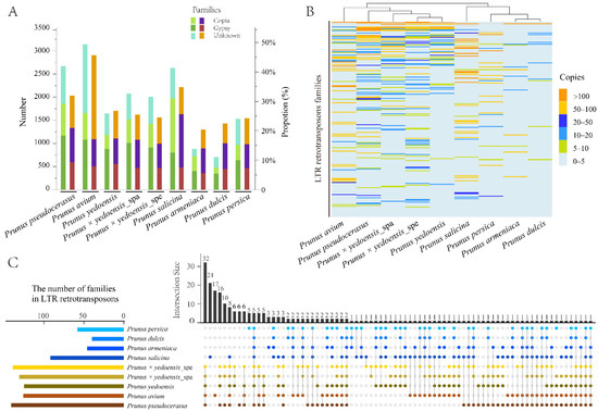 Analyses of LTR-RTs in nine haploid genomes. (A) The copy numbers (N) of full-length LTR-RTs and proportions (P) of TLR-RT content in genomes. (B) Copy number differences of full-length LTR-RTs in different clusters among genomes. (C) UpSetR of the LTR-RT clusters shared by the Prunus subgenus Cerasus and its relatives. Intersection sizes on the vertical bars represent the numbers of LTR-RT clusters for a given pattern. The horizontal bars on the left show the whole clusters of LTR-RTs detected in each species. Datasets appearing in intersections are shown with spots.