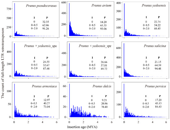 The insertion ages of LTR-RTs were estimated according to nucleotide substitution to gain insight into their evolution. It can be noted that the majority of LTR-RTs (from a minimum of 70.40% in P. dulcis to a maximum of 94.48% in P. salicina) were inserted approximately 2 million years ago (MYA) (Figure 2), and they occurred after species divergence. In general, similar insertion time patterns were observed among these eight species. However, it should be noted that a massive amplification of LTR-RTs is currently underway (0.0 MYA), suggesting that different levels of activity are maintained among LTR-RTs. In particular, for tetraploid P. pseudocerasus and two interspecific diploid hybrid flowering cherry species, P. yedoensis and P. × yedoensis, the ratio of recently inserted elements was more than 20%, while it was less than 20% in other genomes, except for P. salicina (21.15%).
