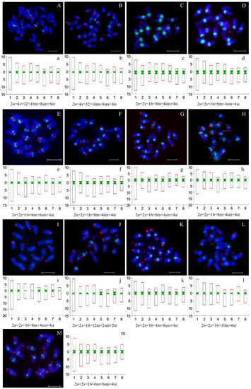 Chromosomal distribution of centromeres and telomeres among P. pseudocerasus and nine relatives. Green and red signals represent the distributions of centromeres and telomeres, respectively. (A–M) Chromosomal distribution of centromeres and telomeres of different species. a–m: Ideigram and karyotype formula of different species. (A(a),B(b)) P. pseudocerasus, HC and XC1; (C(c),D(d)) P. avium, ‘Mazzard’ and ‘Van’; (E(e)) P. campanulate, Pcampan; (F(f)) P. yedoensis, Pyedoensis; (G(g)) P. humilis, Phumilis; (H(h),I(i)) P. tomentosa, red and white fruit; (J(j)) P. salicina, ‘Cuihongli’; (K(k)) P. armeniaca, ‘diaogan’; (L(l)) P. dulcis, Pdulcis; and (M(m)) P. persica, Ppersica.