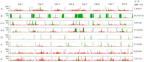 Distribution of centromere-associated and telomeric repetitive sequences on pseudochromosomes. Green and red bars represent the centromere and telomere sequences, respectively. The Y-axis indicates the percentage. (bin width: 100 k, step size: 50 k). (A) P. pseudocerasus; (B) P. avium; (C-1) P. × yedoensis_spa; (C-2) P. × yedoensis_spe; (D) P. salicina; (E) P. armeniaca; (F) P. dulcis; and (G) P. persica. The contents and proportions of the centromere sequences are shown on the right side for each haploid genome. C represents contents (Mb); P represents percentages (%).