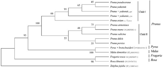 Cerasus belongs to the Rosaceae family, and is an important subgenus of the genus Prunus. This genus contains many crucial economic drupe fruits, such as peach, mei, plum, apricot and almond, which are mainly consumed when fresh around the world because of their high nutritional value and desirable taste [1]. Many species of this genus also present many high ornamental and economic value for their flowers, which are loved by people all over the world [2,3]. The genus Prunus consists of more than 250 species, most of which are diploid in cultivated species, except for tetraploid Chinese cherry (P. pseudocerasus), sour cherry (P. cerasus) and hexaploid European plum (P. domestica).