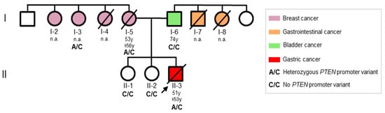 To better elucidate the role of the identified PTEN promoter variant in the clinical phenotypes of the family under study, we performed a segregation analysis. This variant was not detected in the healthy first-degree relatives tested (Figure 1, II-1, II-2), nor in the father of the index patient (Figure 1, I-6), but was found in the mother (Figure 1, I-5) and in one maternal aunt (Figure 1, I-3). In this family, the heterozygous PTEN variant NM_000314.4:c.-1026C>A (rs34149102 A allele) seems to be associated with the clinical findings of the index patient (macrocephaly, multiple oral papillomas, lipomas, and GEJ adenocarcinoma) and his relatives (breast cancer), which are, in part, included in the phenotypic spectrum of PHTS [17,18].