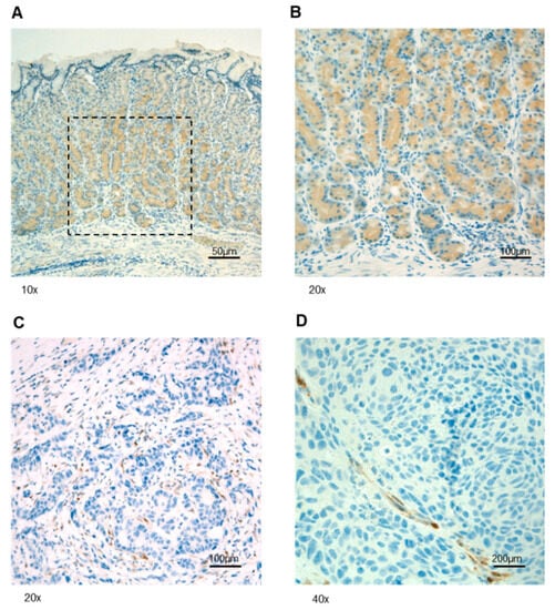 Representative IHC staining of PTEN protein expression in tissues from the index case. (A) Normal gastric epithelium showing cytoplasmic staining. (B) Higher magnification of the squared area shown in (A). (C,D) GEJ tissue showing positive staining in normal stromal (C) and endothelial (D) cells and a lack of reactivity in cancer cells.