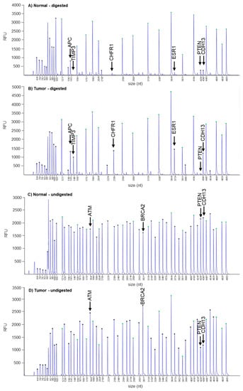To perform methylation-specific MS-MLPA, we used the ME001-D1 Tumor Suppressor-1 Kit (MRC Holland, Amsterdam, The Netherlands). This kit enables a total of 25 tumor suppressor genes (APC, ATM, BRCA1, BRCA2, CADM1, CASP8, CD44, CDH13, CDKN1B, CDKN2A, CDKN2B, CHFR, DAPK1, ESR1, FHIT, GSTP1, HIC1, KLLN, MLH1, PTEN, RARB, RASSF1, TIMP3, TP73, VHL) to be analyzed for aberrant promoter methylation and copy number variations. Experimental procedures were carried out according to the manufacturer’s instructions. Briefly, a total of 100 ng of DNA was denatured and then annealed overnight at 60 °C to the MS-MLPA probe mix. Subsequently, half of the sample was ligated by adding Ligase-65 (MRC-Holland, Amsterdam, The Netherlands) and incubated at 49 °C for 30 min, whereas the other half was digested using the Hha1 restriction enzyme. Ligation products were amplified by PCR according to the manufacturer’s instructions (MRC-Holland, Amsterdam, The Netherlands). The ligase enzyme was inactivated by heating at 98 °C for 5 min. PCR was performed according to the manufacturer’s instructions (MRC-Holland, Amsterdam, The Netherlands). Subsequently, PCR reaction fragments were separated and visualized on an automated sequencer (Applied Biosystems 3130 Genetic Analyzer, Thermo Fisher Scientific, Waltham, MA, USA). A normal DNA sample was used as a control.