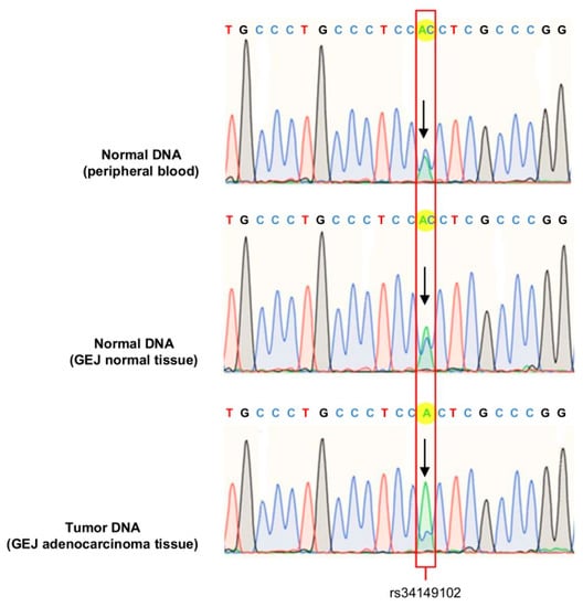 To gain further insight into the occurrence of the somatic inactivation of the second allele, we analyzed GEJ adenocarcinoma and normal tissue from the index patient to evaluate the mutational status of the PTEN promoter. The PTEN sequence electropherogram of normal DNA (GEJ normal tissue and peripheral blood samples) revealed equivalent proportions of the rs34149102 major C allele and rs34149102 minor A allele. In contrast, the rs34149102 minor A allele was predominant in DNA from tumor tissue, indicating the occurrence of copy number loss involving the PTEN rs34149102 major C allele in the index patient’s GEJ adenocarcinoma tissue (Figure 4).