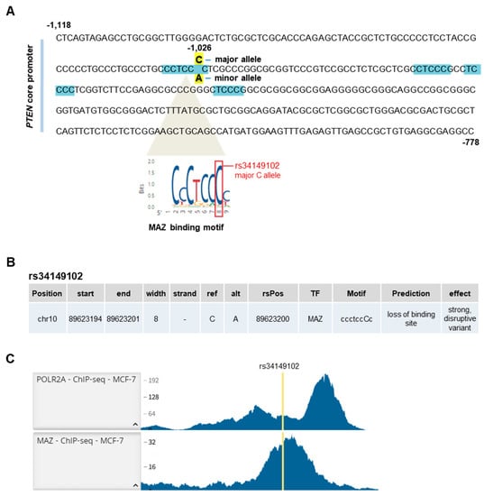 In silico analysis of the region encompassing the rs34149102 locus. (A) PTEN core promoter region (bp −1118/−778). The MAZ recognition motif encompassing the rs34149102 major C allele (bp −1026) and the other three putative MAZ binding sites are highlighted in light blue. (B) Predicted effects of the rs34149102 A allele on MAZ binding by using MatInspector, PROMO, and OncoBase prediction tools. ref = reference allele; alt = alternative allele; rsPos = rs34149102 genomic position. (C) RegulomeDB ChIP-seq data of Pol II (POLR2A) and MAZ binding in the promoter region encompassing the rs34149102 locus in the MCF-7 breast cancer cell line.