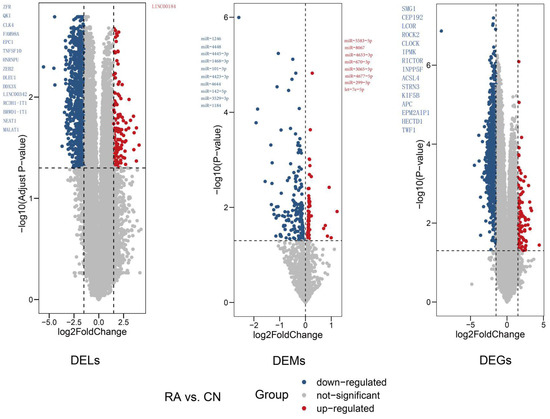 This study used GEO2R, a software platform that automatically performs deviation control analysis for differential expression analysis. Firstly, the differentially expressed lncRNAs (DELs, adj.P.Val < 0.05 and |log FC| > 1.5) between RA and normal samples were screened. At the same time, differentially expressed miRNAs (DEMs) between RA and normal samples were screened, with the cutoff criteria of a p-value of < 0.05. In addition, differentially expressed mRNAs (DEGs) between RA and normal samples were screened based on adj.P.Val < 0.05 and |log FC| > 1.5. Next, the DELs, DEMs, and DEGs were used for subsequent analysis.