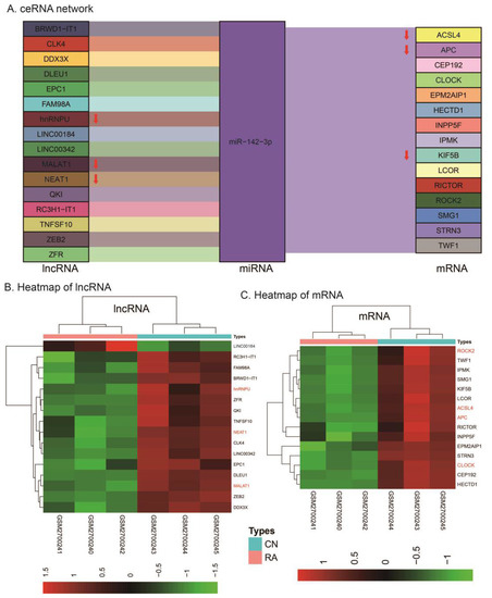 As shown in Figure 3A, a ceRNA network, including 16 lncRNAs (especially for hnRNPU, MALAT1, and NEAT1), 1 miRNA (miR-142-3p), and 15 mRNAs (especially for ACSL4, APC, CLOCK, and ROCK), was constructed with p-values smaller than 0.05. Fifteen of the lncRNAs were downregulated and all 15 mRNAs were downregulated in RA (Figure 3B,C).