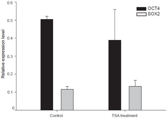 Besides improving the expression delay of OCT4, we tested the effect of TSA treatment on the expression of pluripotent genes OCT4 and SOX2. Our results of q-PCR show that TSA treatment has no significant effect on the expression of OCT4 and SOX2 (Figure 4). Studies of TSA mainly focused on its role in acetylation regulation. It has been proved that TSA treatment could decrease the acetylation level of SCNT embryos [31,32,33]. As an epigenetic modification, low-level acetylation facilitates gene expression and is considered to be the main determinant for successful reprogramming. We failed to detect a significant difference between TSA-treated embryos and controls, and this is consistent with previous results in cloned mouse and pig blastocysts [31,34]. Given that the expression of pluripotency genes OCT4 and SOX2 is regulated strictly and dynamically in early development [35], those data do not support the conclusion that TSA does not affect the expression of OCT4 and SOX2. This is because results in this and other studies were obtained at a single time point during the preliminary development of embryos (E4 or blastocyst stage) [31,34]. To comprehensively investigate the effect of those HDAC inhibitors on the pluripotent gene expression, samples at multiple time points should be collected to perform tests.