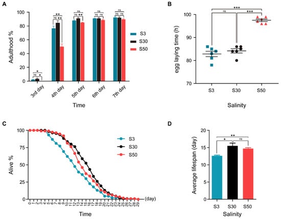 Interestingly, HQ1 worms acclimated quite well to the low-salinity condition (0.3% NaCl, referred to as “S3”) which is the standard culture condition for terrestrial C. elegans. We observed that, under S3 condition, 2% of L1s developed into adulthood within 3 days, the adulthood percentage was about 92% on the 7th day, and the earliest egg laying time was around 83 h post L1 stage, which showed no significant differences compared with the S30 group (Figure 1A,B). However, worms’ lifespan under S3 were slightly shorter: L4 worms lived as long as 27 days (Figure 1C), with an average lifespan of about 13 days (Figure 1D).