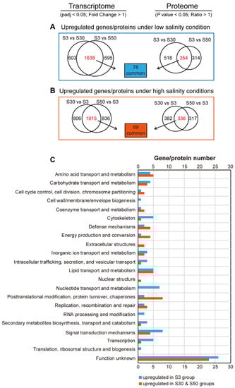 Identification of genes expressed consistently at both mRNA and protein levels under low- and high-salinity conditions. (A) Identification of 78 genes with up-regulated expression at both mRNA and protein levels under the low-salinity condition (S3 group) compared with high-salinity conditions (S30 and S50 groups). DESeq2 padj < 0.05; fold change > 1 was set as the differential gene screening threshold. p value < 0.05; Ratio > 1 was set as the differential protein screening threshold. (B) Identification of 69 genes with up-regulated expression at both mRNA and protein levels under high-salinity conditions (S30 and S50 groups) compared with the low-salinity condition (S3 group). DESeq2 padj < 0.05; fold change > 1 was set as the differential gene screening threshold. p value < 0.05; Ratio > 1 was set as the differential protein screening threshold. (C) Classification of differential genes expressed under low- and high-salinity conditions based on COG annotation.