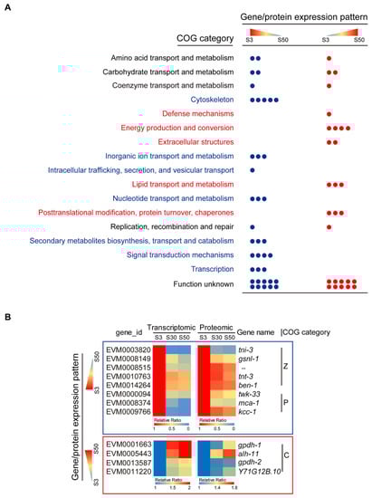Interestingly, not only was the salinity difference between the S50 and S30 conditions smaller than that between the S3 and S30 conditions, but we also noticed a similar tendency in the number of DEGs and DEPs identified within different comparisons (Figure 2A,C), i.e., the difference between the S50 and S30 groups was smaller than that between the S3 versus S30 comparison pair, especially for DEGs. Herein, we will refer to these worms which were acclimated to S3 environment as the “low-salinity group”, while worms grown under S30 and S50 environments as the “high-salinity groups”. In order to identify crucial genes related to euryhalinity, we tried to screen genes that were expressed consistently at both mRNA and protein levels.