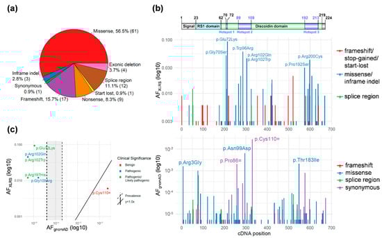 RS1 variant types and localizations in the XLRS cohort and gnomAD. (a) Variant type distribution in the XLRS cohort. (b) RS1 protein domains (Top) and variant allele frequencies (AF) along the cDNA position in the XLRS cohort (middle) and gnomAD (bottom). The splice region variants in the XLRS cohort include intronic variants reported in clinical reports. The splice region variants in the gnomAD dataset include intronic variants in ±3–8 nucleotides from the exon–intron junctions. The gnomAD v2.1.1 dataset does not contain any variants in the ±2 canonical splicing sites. Variants denoted are those with AF > 0.03 in XLRS or >0.001 in gnomAD. (c) Allele frequencies for variants present in both XLRS cohort and gnomAD. Shaded: the XLRS prevalence of 1 in 5000 to 1 in 25,000 males.