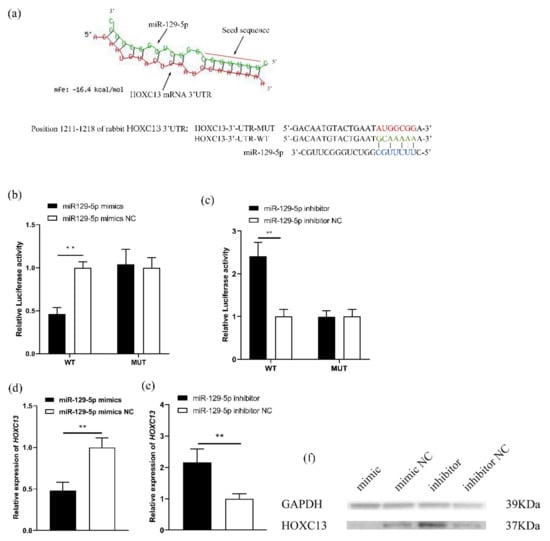 3.3. MiR-129-5p Targeted HOXC13 to Regulate the Expression of the HFDRGs