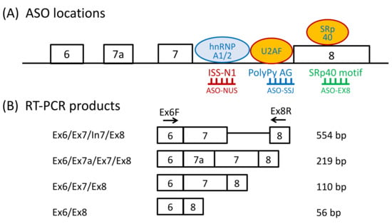 The results of Lim et al. and Flynn et al. were re-tested in our study [9,17]. According to our results, ASO-SSJ and ASO-EX8 slightly increased the level of transcripts with intron 7 retention (Ex6/Ex7/In7/Ex8 in Figure 2A and Figure 4A) and further enhanced the level of transcripts with exon 7 inclusion (Ex6/Ex7/Ex8 in Figure 2A and Figure 4A). ASOs targeting the 3′ splice site/5′ region of exon 8 may improve exon 7 inclusion, suggesting the existence of novel mechanisms potentially associated with unexpected exon 7 splicing.