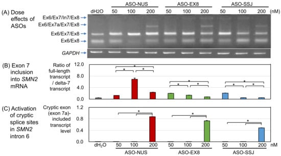 To analyze the effect of the dose of ASOs on the level of transcripts containing exon 7, each ASO was transfected into the SMA type 1 fibroblasts at three concentrations (50, 100, and 200 nM), followed by analysis of SMN2 transcript expression (Figure 2A). Here, distilled water without ASOs was used as a reference. The intensity of each band was determined to evaluate the levels of transcript isoforms (Supplementary Tables S1–S3).
