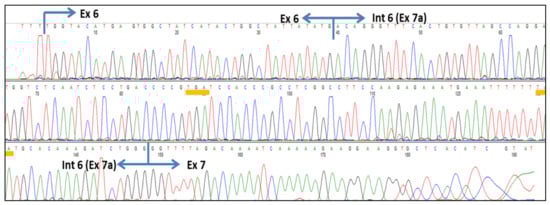 Cryptic exon creation: In addition, 200 nM ASO-NUS produced a new transcript (an extra band of Ex6/Ex7a/Ex7/Ex8 in Figure 2A). Nucleotide sequencing analysis demonstrated that this transcript included a sequence of exon 7a between exons 6 and 7, which we previously reported as a cryptic exon in intron 6 [32] (Figure 3). The cryptic-exon-containing transcript was observed only in the cells treated with 200 nM ASO-NUS, but not in the cells treated with 50 and 100 nM ASO-NUS (Figure 2C).