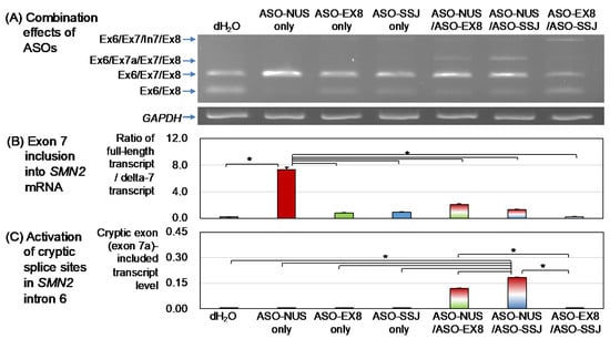 In addition, 200 nM ASO-NUS produced a cryptic exon (exon 7a) transcript in our experiment. In line with this, Ottesen et al. reported that a high concentration of an ASO targeting ISS-N1 caused massive perturbation of the transcriptome, including activation of a cryptic splice site in intron 6 [29]. Remarkably, combinations of ASOs, ASO-NUS/ASO-EX8 and ASO-NUS/ASO-SSJ, as well as a high dose of ASO-NUS, also activated the cryptic splice sites in intron 6 (Figure 4A). We discuss below the activation of the cryptic exon in SMN2 intron 6.