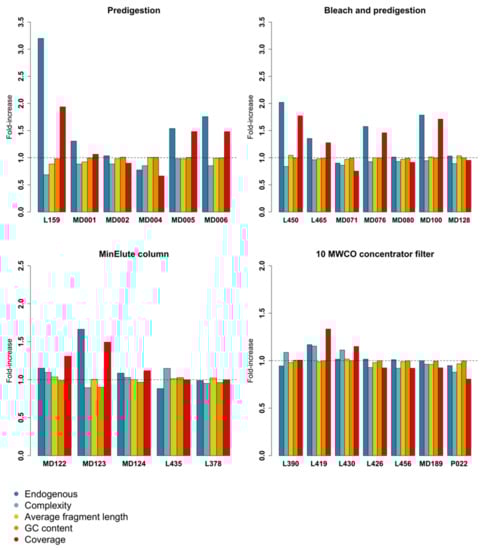 Relative efficiency of predigestion, bleach wash followed by predigestion, different silica columns, and centrifugal concentrator filters with different weight cut-offs, measured on each individual samples’ endogenous DNA content, complexity, average fragment length, GC content, and coverage. The dotted horizontal line marks the one-fold threshold. Bars below or above this threshold indicate that they performed worse or better, respectively, for that parameter compared to the control.