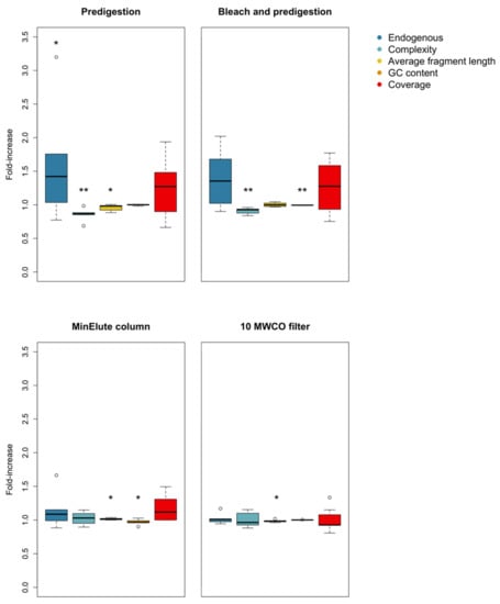 Boxplots of relative efficiency of predigestion, bleach wash followed by predigestion, different silica columns, and centrifugal concentrator filters with different weight cut-offs on (from left to right) endogenous DNA content, complexity, average fragment length, GC content, and coverage. Circles represent outlier values. Statistically significant results are marked with one (p < 0.05) or two (p < 0.01) asterisk(s). Whiskers represent 1.5 interquartile range, whereas boxes represent the first and third quartile. Values above one-fold indicate an increase in the treatment compared to the control for that parameter, whereas values under one-fold indicate a decrease.