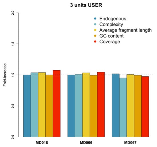 Relative efficiency of different USER concentrations on each samples’ endogenous DNA content, complexity, average fragment length, GC content, and coverage. The dotted horizontal line marks the one-fold threshold. Bars below or above this threshold indicate that the performance of the treatment was worse or better, respectively, for that parameter compared to the control.