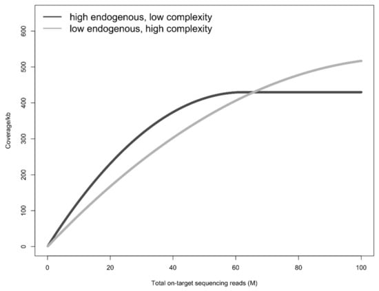 It is important to consider sequencing depth when interpreting the results of pretreatment methods. While the reduced library complexity has a limited effect on coverage at low sequencing depths, as demonstrated by the higher coverage of multiple pretreated samples at low sequencing depths (Figure 1), complexity will become more important as compared to endogenous content at high sequencing depths (see Figure 4 for a conceptual example). If the main aim of a study is to maximize coverage at high sequencing depths (>100 million on-target sequencing reads), higher complexity is probably more desirable than the increase in endogenous content. Conversely, some studies and/or samples might benefit from extraction protocols optimized for endogenous DNA content and not complexity, such as studies using low-depth sequencing data (e.g., [52]), or for the removal of contaminants, such as studies on ancient humans, for which contamination from modern humans might still pose a challenge.