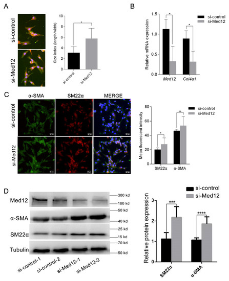 After MOVAS were transfected with si-control or si-Med12 for 72 h, the downregulation of Med12 generated clear alterations in cell morphology. The si-Med12 group developed filiform extensions, visualized by an increase in the length-to-width ratio compared to the si-control group (length/width; 5.76 vs. 3.09; p < 0.05) (Figure 4A). Meanwhile, compared with the si-control group, the expression of Clo4a1 (the marker of the synthetic phenotype) decreased by 35.55% (p < 0.05) in the si-Med12 group (Figure 4B). These morphometric changes are consistent with a contractile phenotype. α-SMA and SM22α, as marker proteins, were highly expressed in contractile vascular smooth muscle cells [11]. Immunofluorescent staining revealed that α-SMA and SM22α in the si-Med12 group were upregulated by 15.45% (p < 0.05) and 27.14% (p < 0.01), respectively (Figure 4C). Accordingly, the Western blot showed that SM22α and α-SMA increased by 1.9-fold (p < 0.01) and 1.7-fold (p < 0.001) (Figure 4D), respectively, in the si-Med12 group compared to the si-control group. These results suggest that the phenotypic transformation of MOVAS was inhibited by the downregulation of Med12 expression.