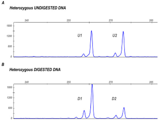 In the formula reported, D1 and D2 represent the two peak areas from the digested sample, and U1 and U2 are the corresponding areas of the alleles obtained from undigested DNA (to correct for preferential amplification of smaller alleles) (Figure 1).